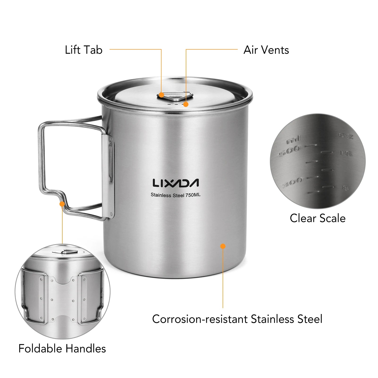 LIXADA Portable 750ml Stainless Steel Pot Water Mug Cup with Lid and Foldable Handle Outdoor Camping Cooking Picnic Drinkingware